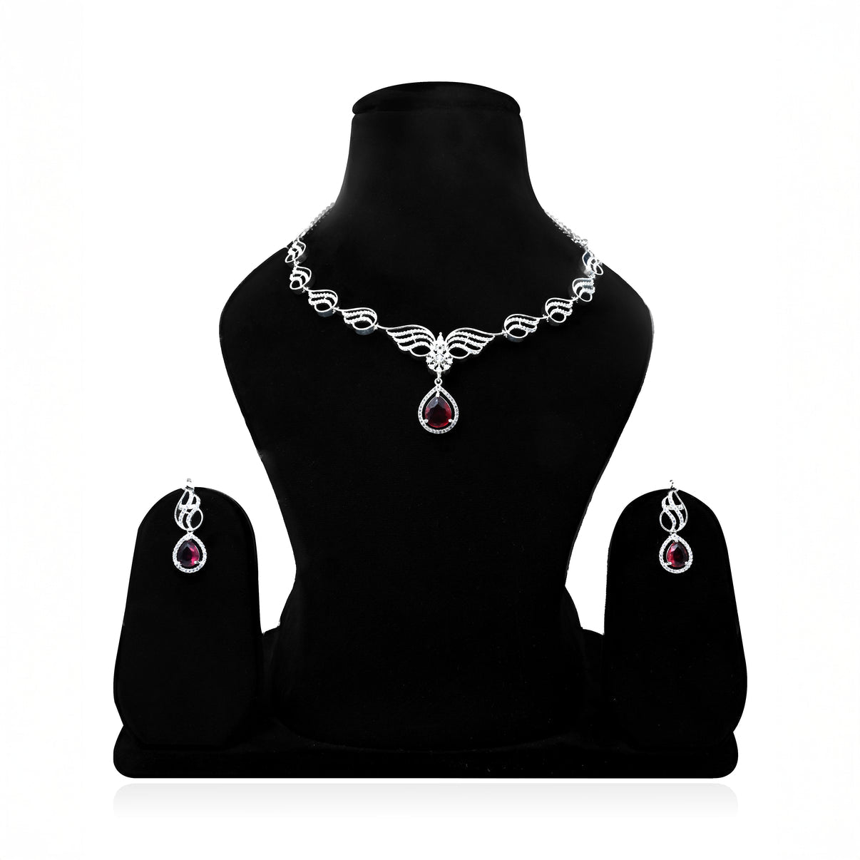 Luxury Silver Necklace and Earring Set Featuring Bold Blood Red Water Drop Stone.Luxury Silver Necklace and Earring Set Featuring Bold Blood Red Water Drop Stone.Luxury Silver Necklace and Earring Set Featuring Bold Blood Red Water Drop Stone.