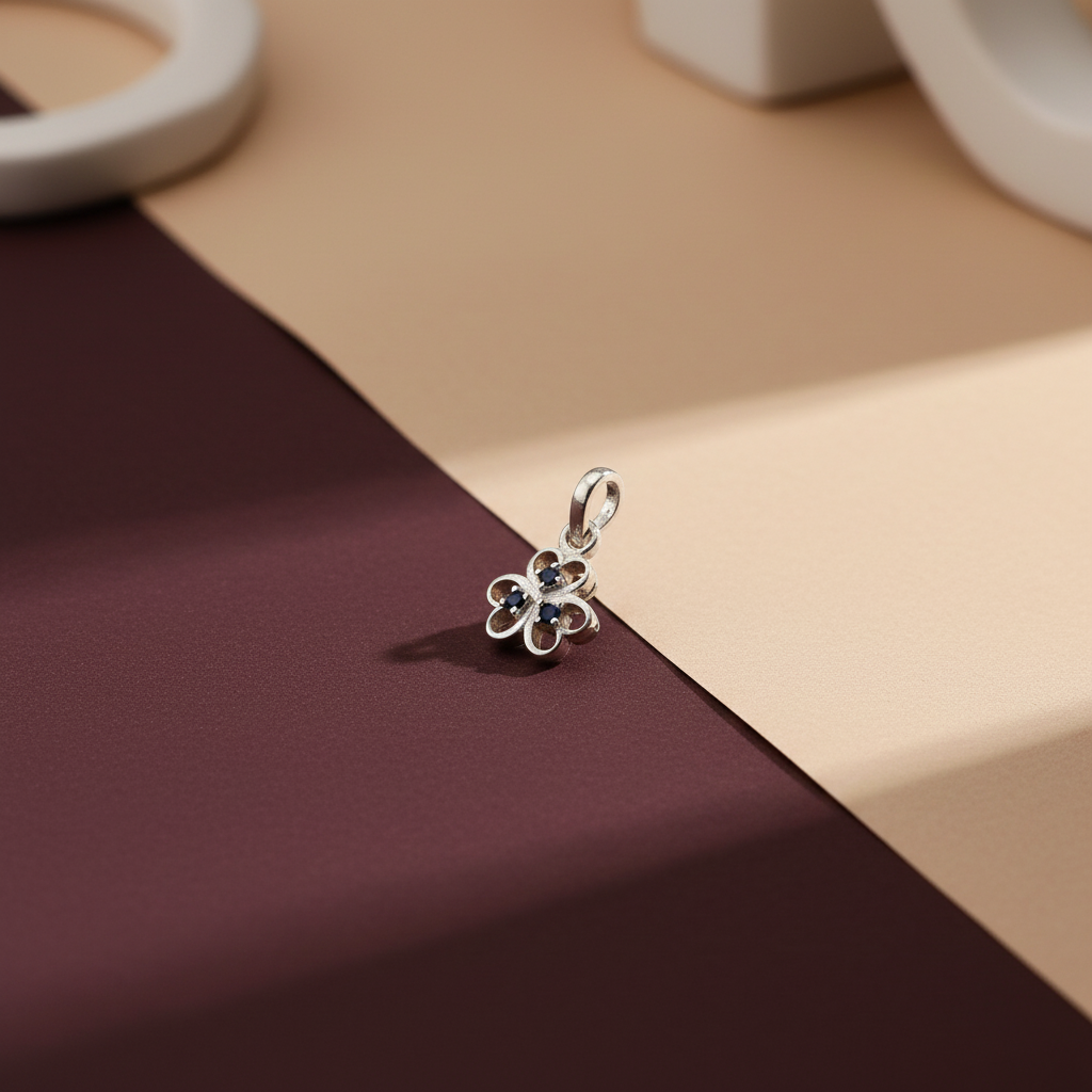 Sterling silver pendant featuring an intricate floral design with a captivating blue stone centrepiece. Crafted from premium 925 sterling silver, this piece combines timeless elegance with contemporary artistry. The delicate floral motif frames the vibrant blue gemstone, creating a sophisticated focal point suitable for both everyday wear and special occasions. The sterling silver ensures durability and a lustrous finish that complements any complexion. An ideal choice for those seeking refined jewellery that balances ornate detailing with understated luxury.