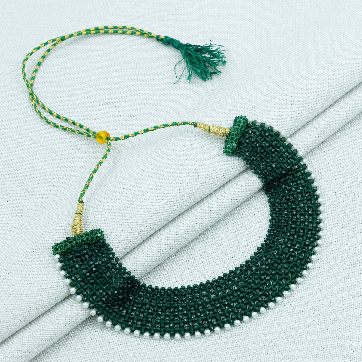 Elevate your collection with this exquisite handmade necklace, where traditional craftsmanship meets contemporary elegance. The rich green/maroon chatai work—a time-honoured jewellery technique—forms the centerpiece, while a delicate pearl border adds refined sophistication and luminous contrast. Each piece is meticulously crafted by skilled artisans, ensuring unique character and premium quality. Perfect for festive occasions, weddings, or as a treasured everyday statement piece. The harmonious blend of vibrant green/maroon and lustrous pearls creates a versatile accessory that complements both traditional and modern wardrobes.
